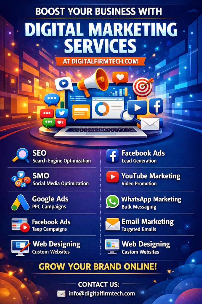 Welcome to DigitalFirmTech, a results driven Digital Marketing Agency helping businesses grow online with powerful, data driven strategies. We specialize in SEO services, Social Media Marketing, Google Ads, Facebook Ads, YouTube Marketing, WhatsApp Marketing, Email Marketing, and Web Designing to boost your brand visibility, generate quality leads, and increase conversions.